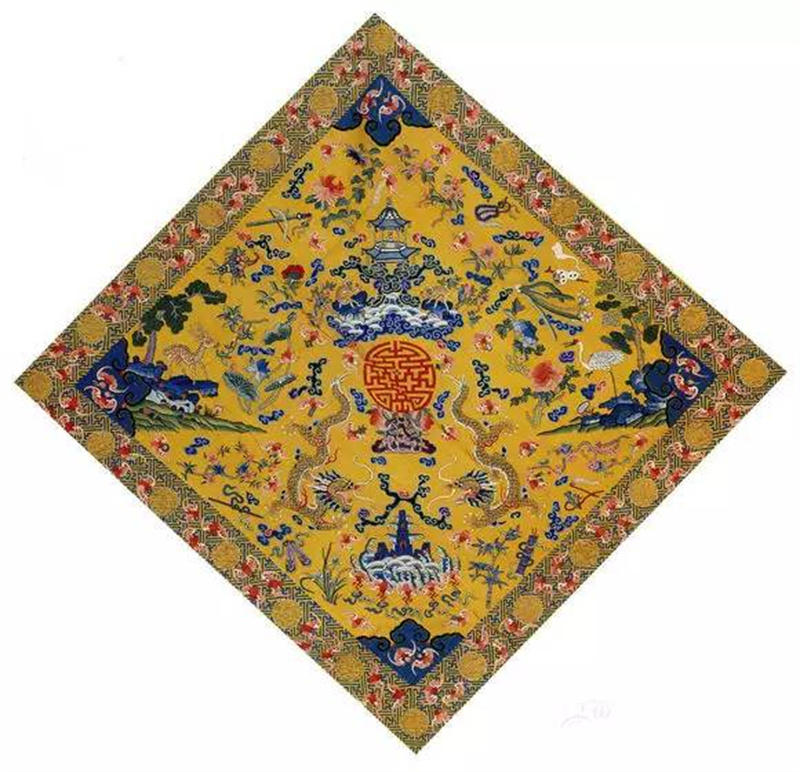 怀裆,是皇帝用膳时的专用品,相当于现在的餐巾。这餐巾的缂丝材质弥足昂贵和奢侈,怀裆上面的纹样和花卉多有“富贵长寿”的美好寓意。就如下图所示的故宫博物院藏光绪皇帝的《缂丝黄地二龙捧寿纹怀裆》,就寓有“长寿”和“祝寿”之意。