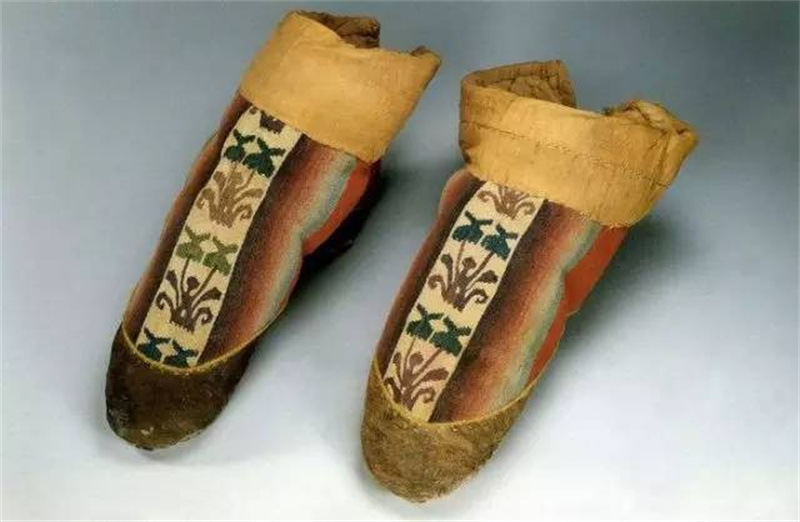 新疆尼雅遗址出土的一双缂毛靴,靴面以缂毛制成,中间一道白地花卉纹,两边为紫、红、白、蓝的退晕缂织,靴口缘绢,靴头包革,靴内衬毡。缂毛之名借自缂丝,即以平纹或斜纹为基本组织、用通经断纬的方法织出图案的毛织物。