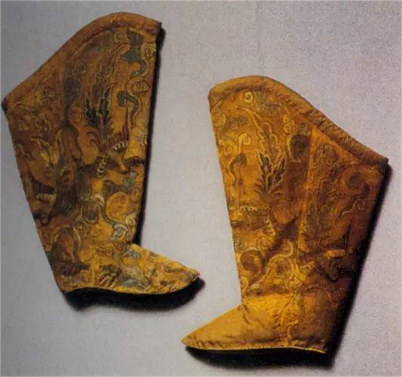 靴子,北方游牧民族习惯于骑马穿靴,而在靴子里面穿丝织品做成的软靴,起到保护皮肤和保暖的作用。这一双出土于辽代的凤纹女靴,每片用五彩丝线缂织相对的凤凰和卷草纹样。凤凰翅膀苍劲有力,凤尾飘逸舒展,使得整只凤凰栩栩如生。缂功精湛,凤凰头部和翅膀等主要部位均用捻金线缂织,应为皇家之物。
