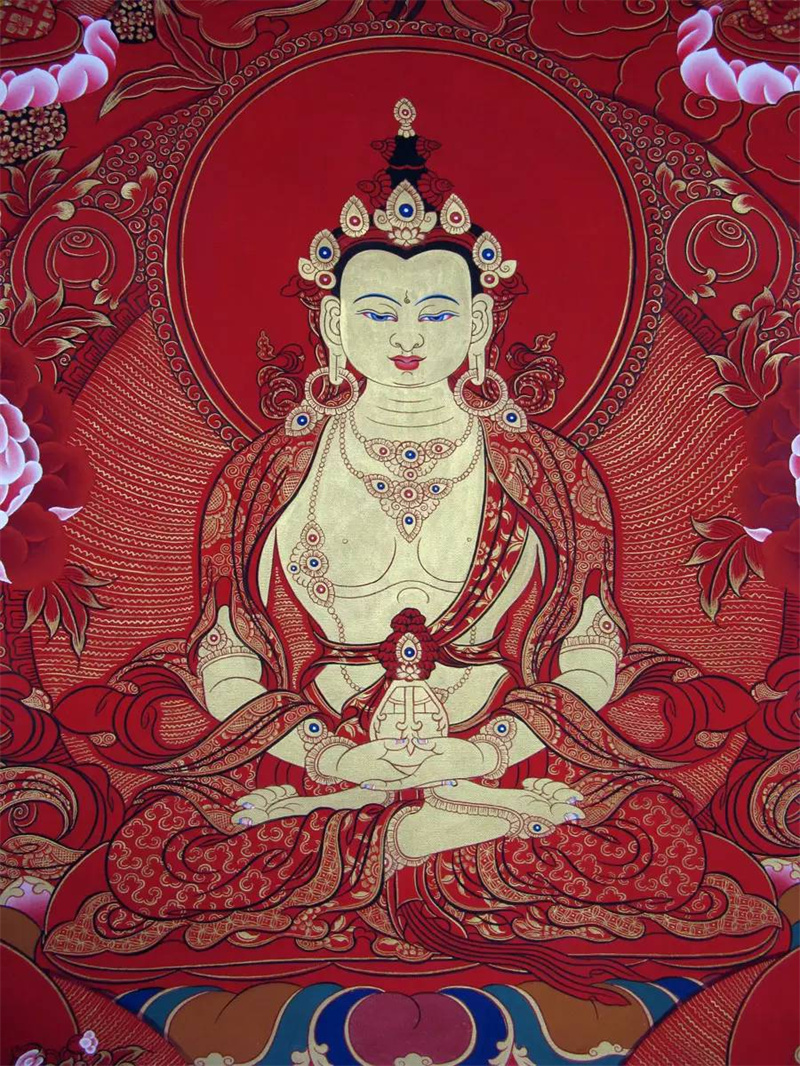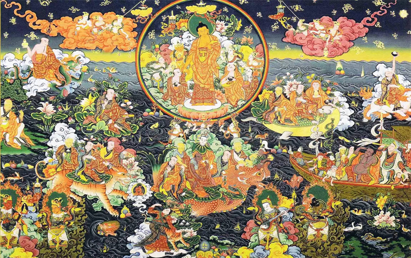 其中最常见的是宗教画——佛像,这种唐卡一般在中心位置描绘主要人物,从画面上角开始,围绕主体按顺时针方向与中心人物有关的人物、活动场所或故事布满一周。