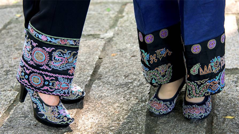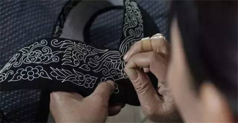 “马尾绣”绣花鞋(水语称为“者结”)是一种翘尖布鞋,鞋尖呈尖形往上翻翘。制作方法是在鞋帮上先用彩色丝线刺绣成底色图案,通常以水族吉祥图腾的花、鸟、鱼、兽、龙、凤等为图案出现在服饰上,以蓝、青为底色的服饰配以纯手工马尾绣,色彩素雅,精美绝伦。然后再采用马尾绣的方法,用丝线缠马尾,卷曲成各种几何形图案拼镶在鞋帮上,边缘镶补。其工艺十分复杂,但刺绣出的图案立体性强,精美别致。