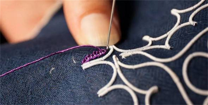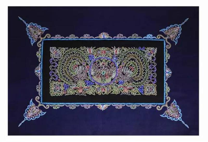 将白丝马尾芯的绣线盘绣于传统刺绣或剪纸纹样的轮廓上,然后用7根彩色丝线编制成扁形彩线,填绣在盘绣花纹的轮廓中间部位。