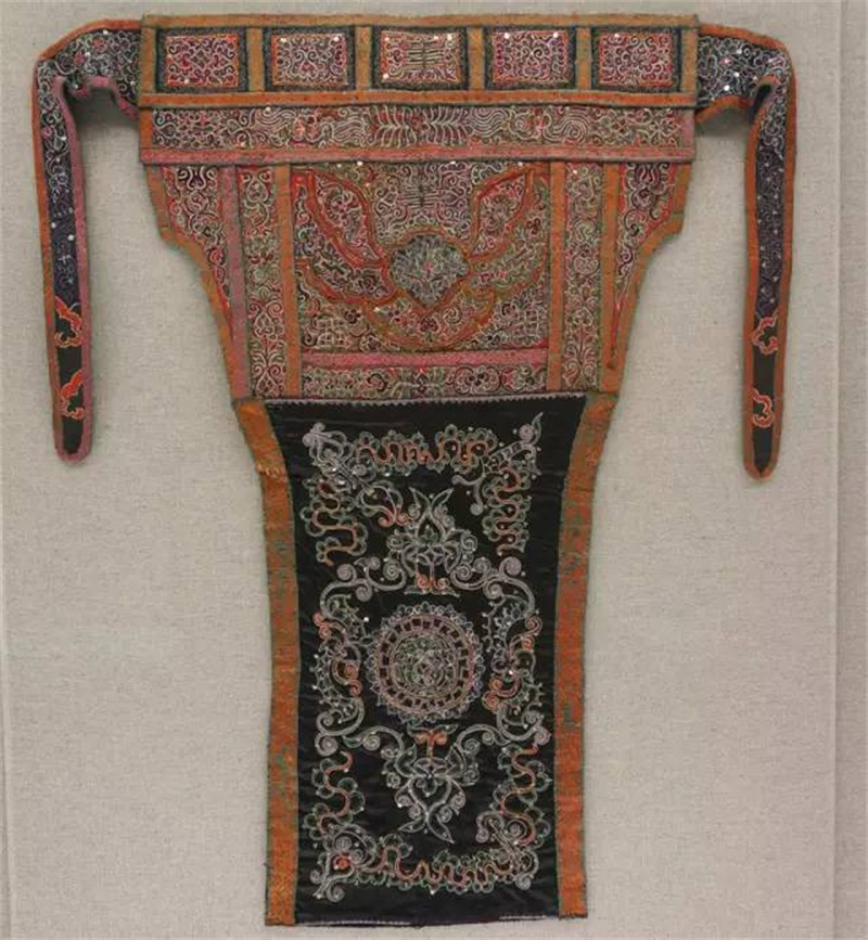 水族马尾绣工艺的杰作制品是马尾绣背带(水语称为"歹结"),上半部为主体部位,由二十多块大小不同的马尾绣片组成,以丝线在彩色锻料底子上平绣出有严格数序规律的几何图案。下半部与主体部位相呼应,也绣有精美的马尾绣图案。