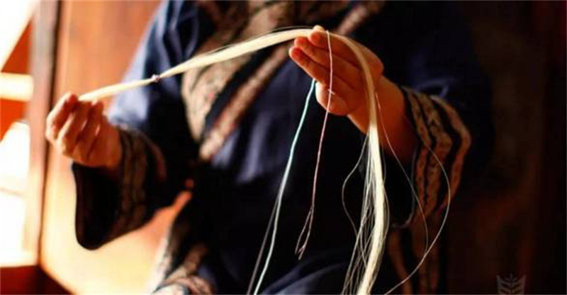马尾绣以马尾为原材料,先取马尾3至4根做芯,用手工将白色丝线紧密地缠绕在马尾上,使之成为类似低音琴弦的预制绣花线。